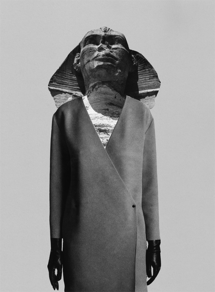 Neutro fotografía la Esfinge. De allí hace un fotomontaje dirigido a una vestimenta cruzada del siglo XX y también de nuestra época de copias. La Esfinge, ese ser con doble faz, divertida y simpática hacia afuera, cruel y despiadada hacia la intimidad, adquiría rasgos en el mito de una belleza poco serena, desafiante.